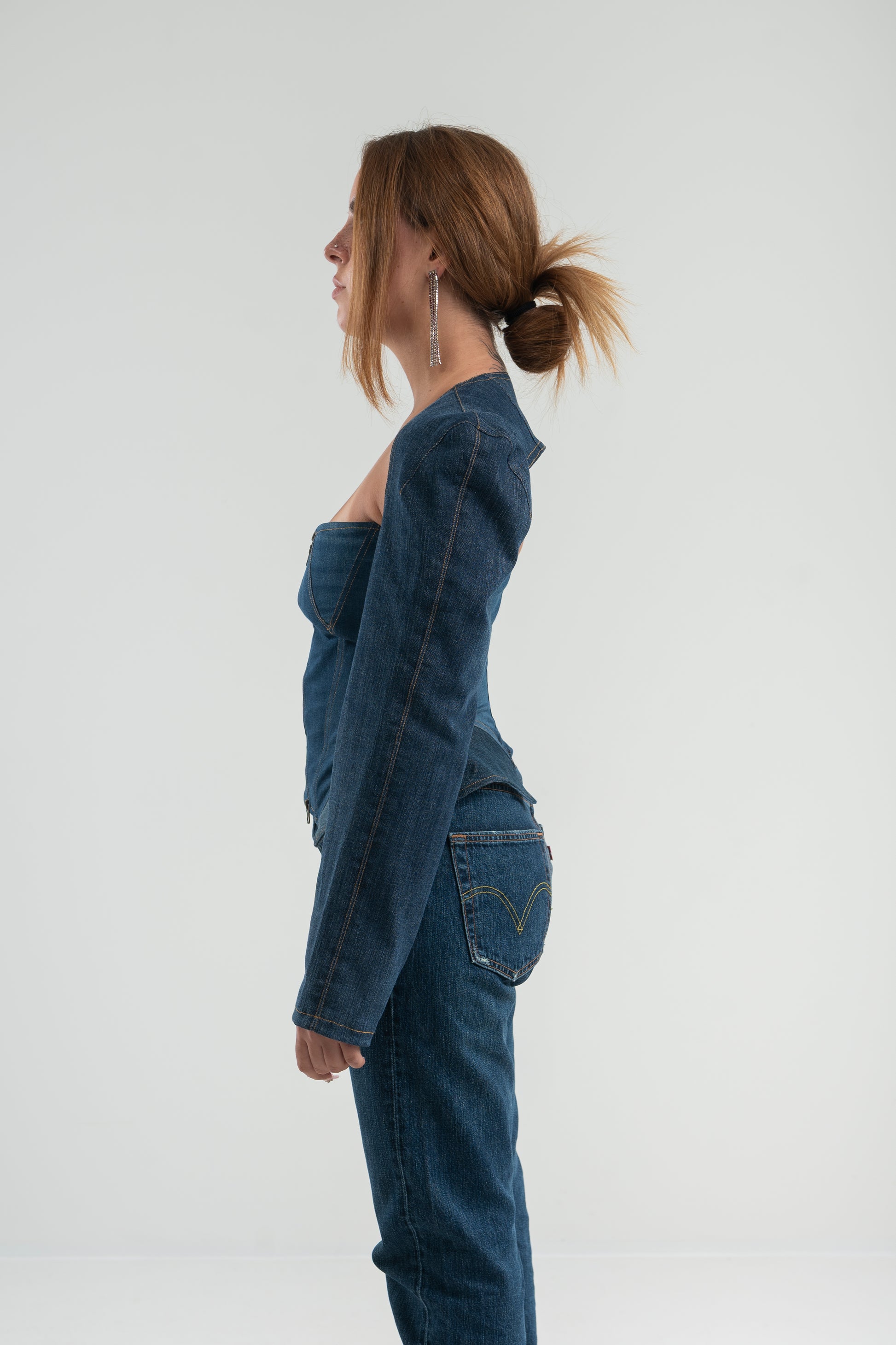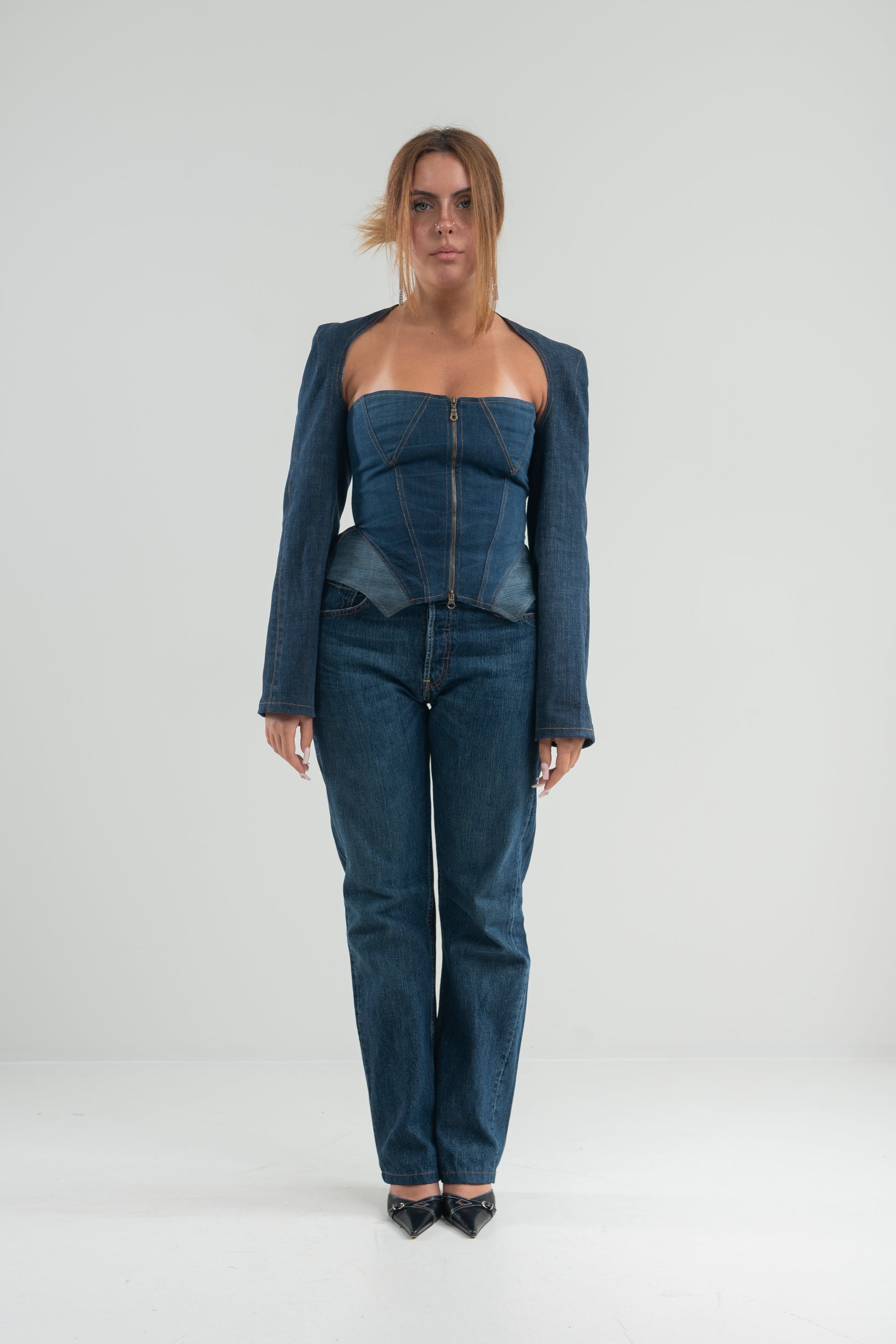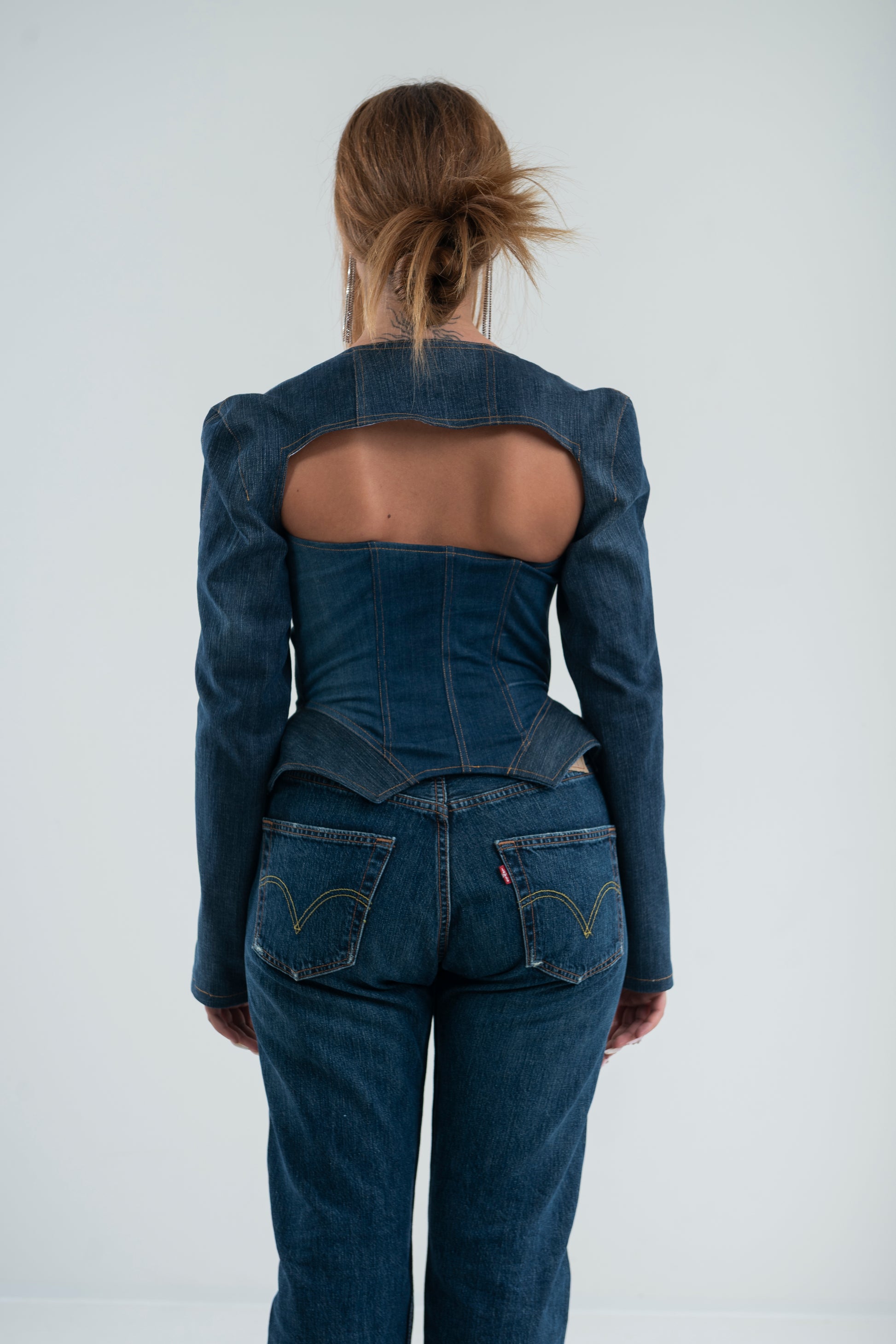 Coprispalle a manica lunga in denim rigenerato, con spalle squadrate.