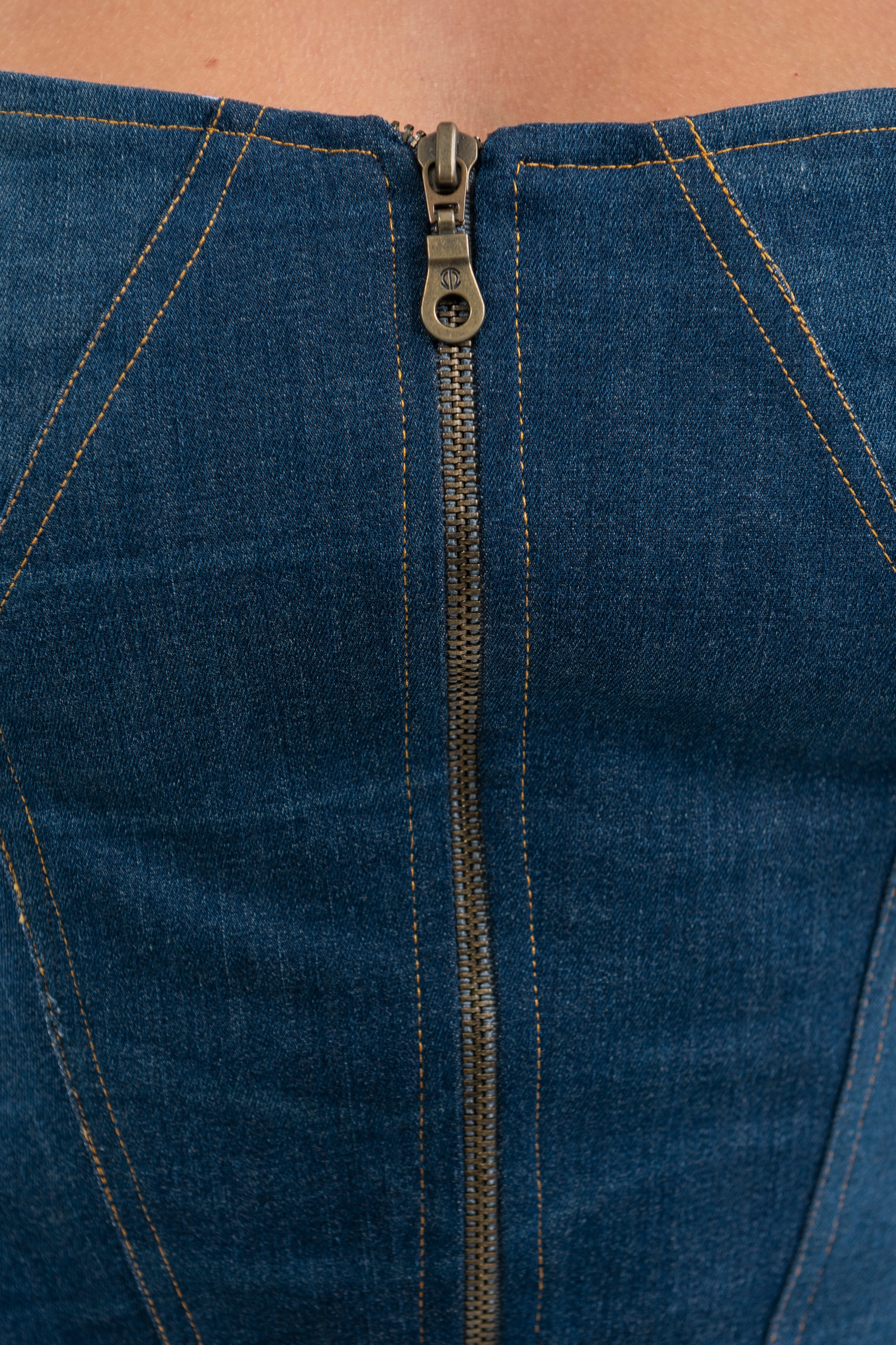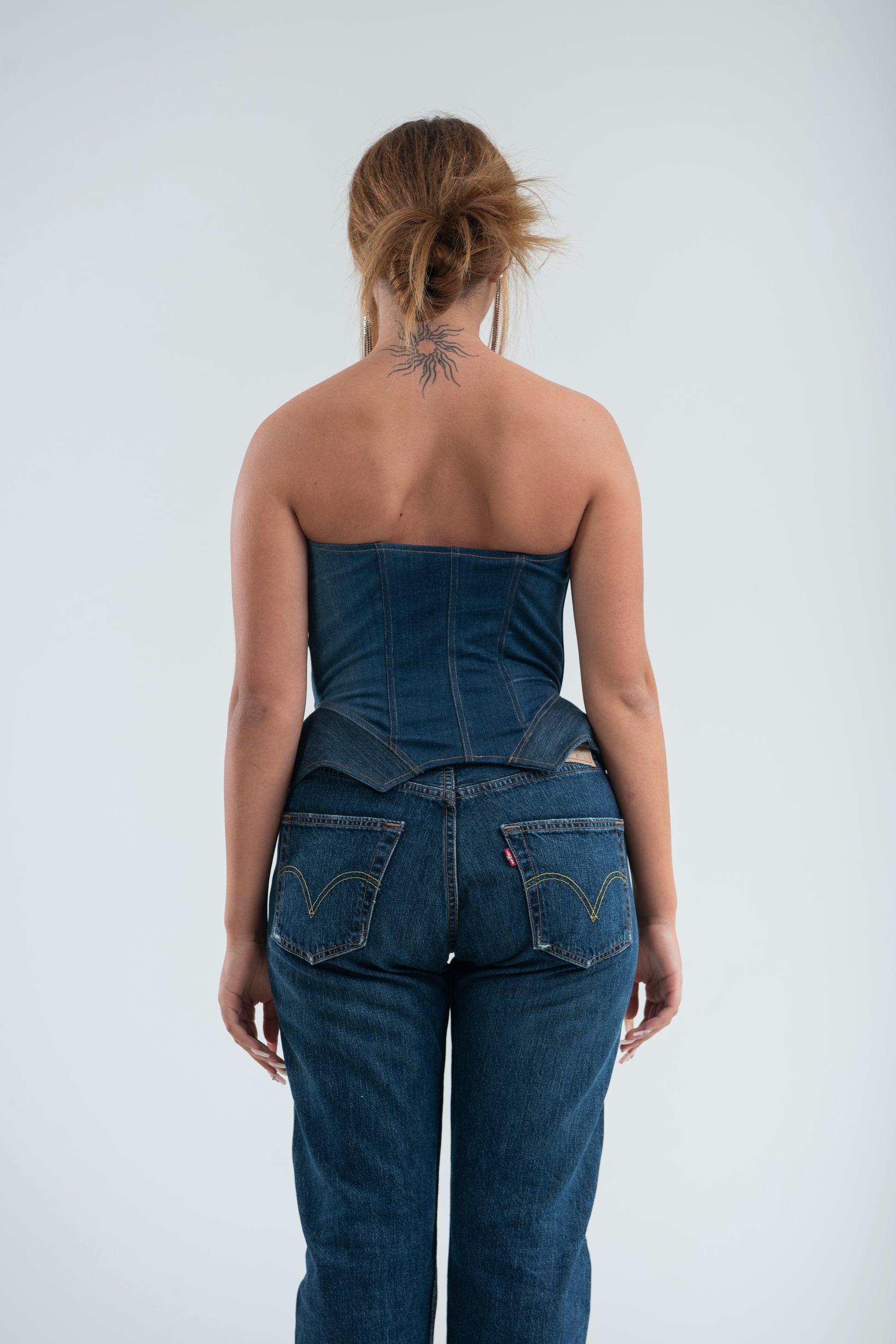 Corsetto strutturato in denim rigenerato con taglio seno triangolare e alette scultoree sui fianchi.