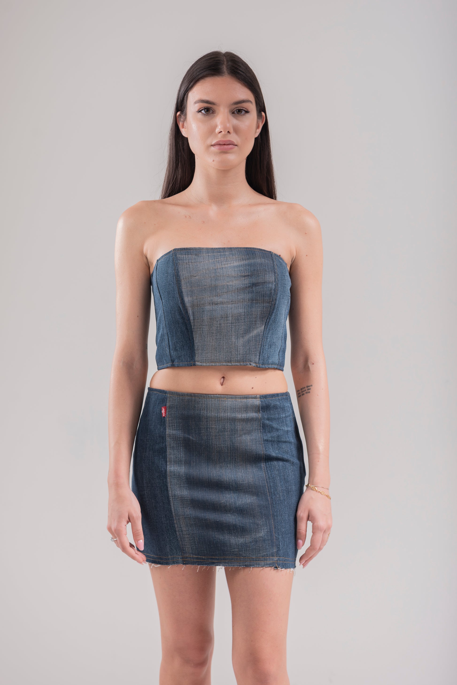 Corsetto steccato in denim rigenerato lungo fino in vita che dona struttura alla parte alta del corpo.