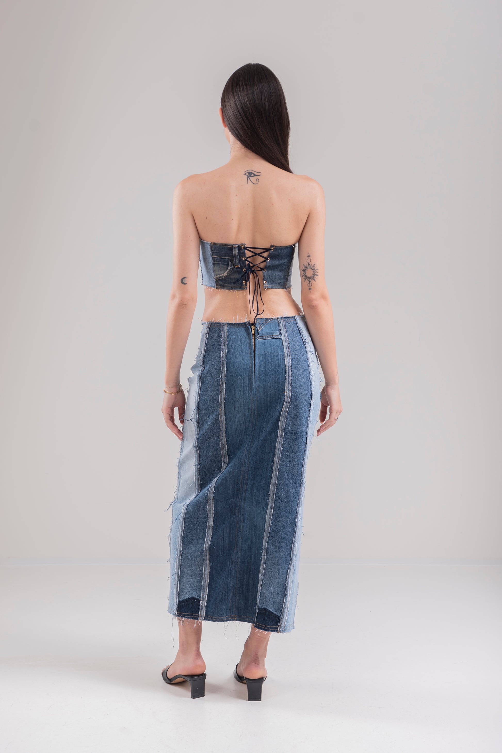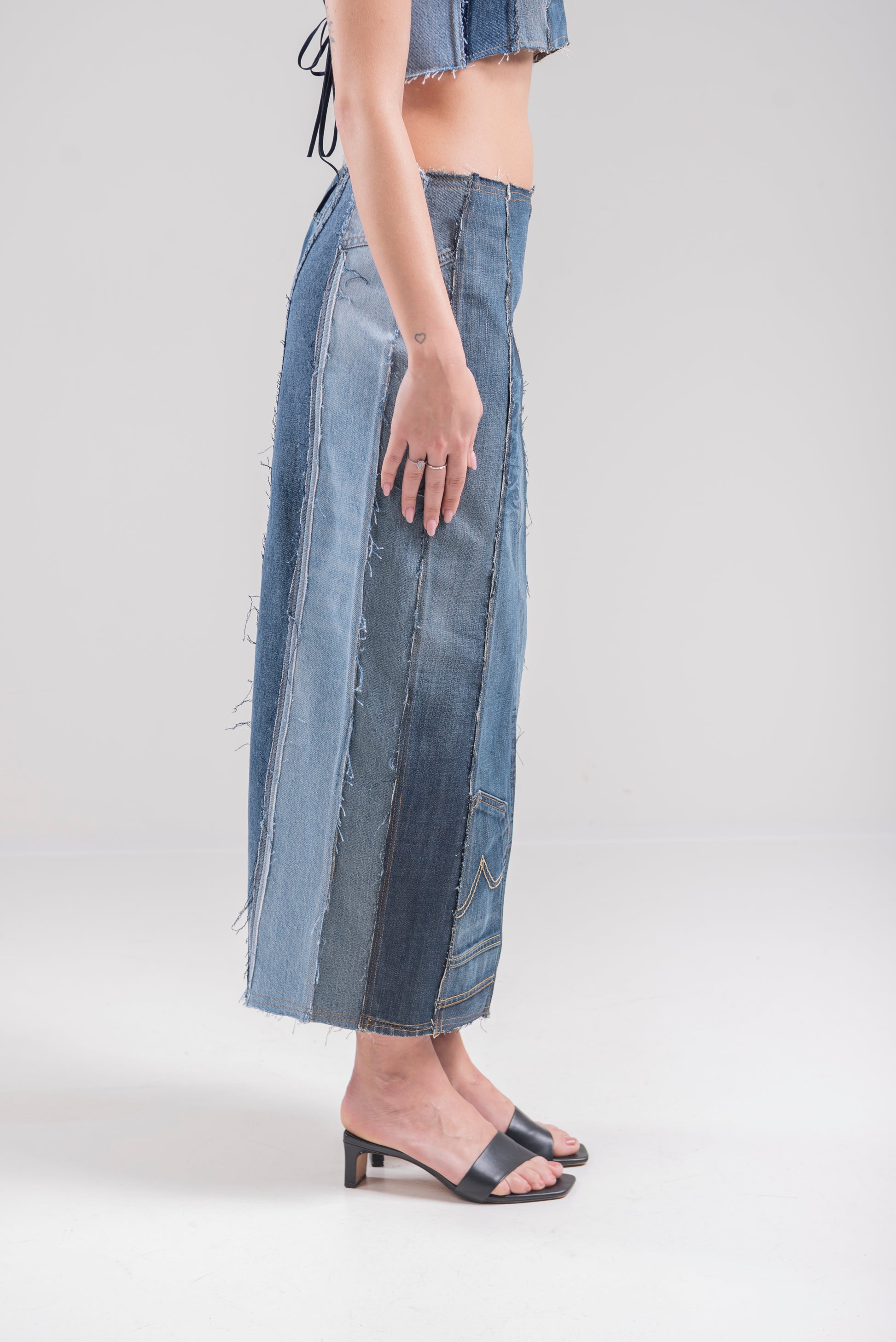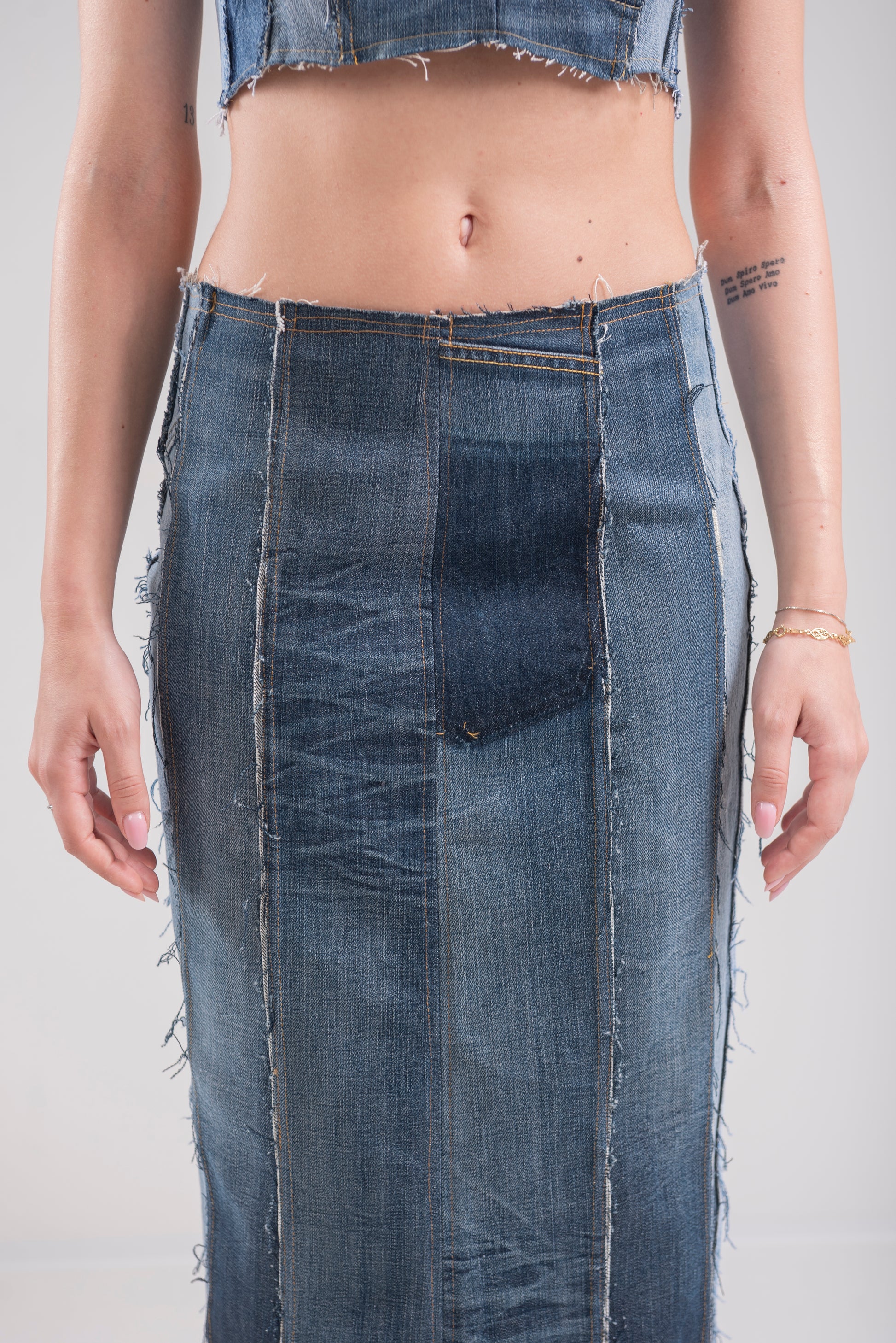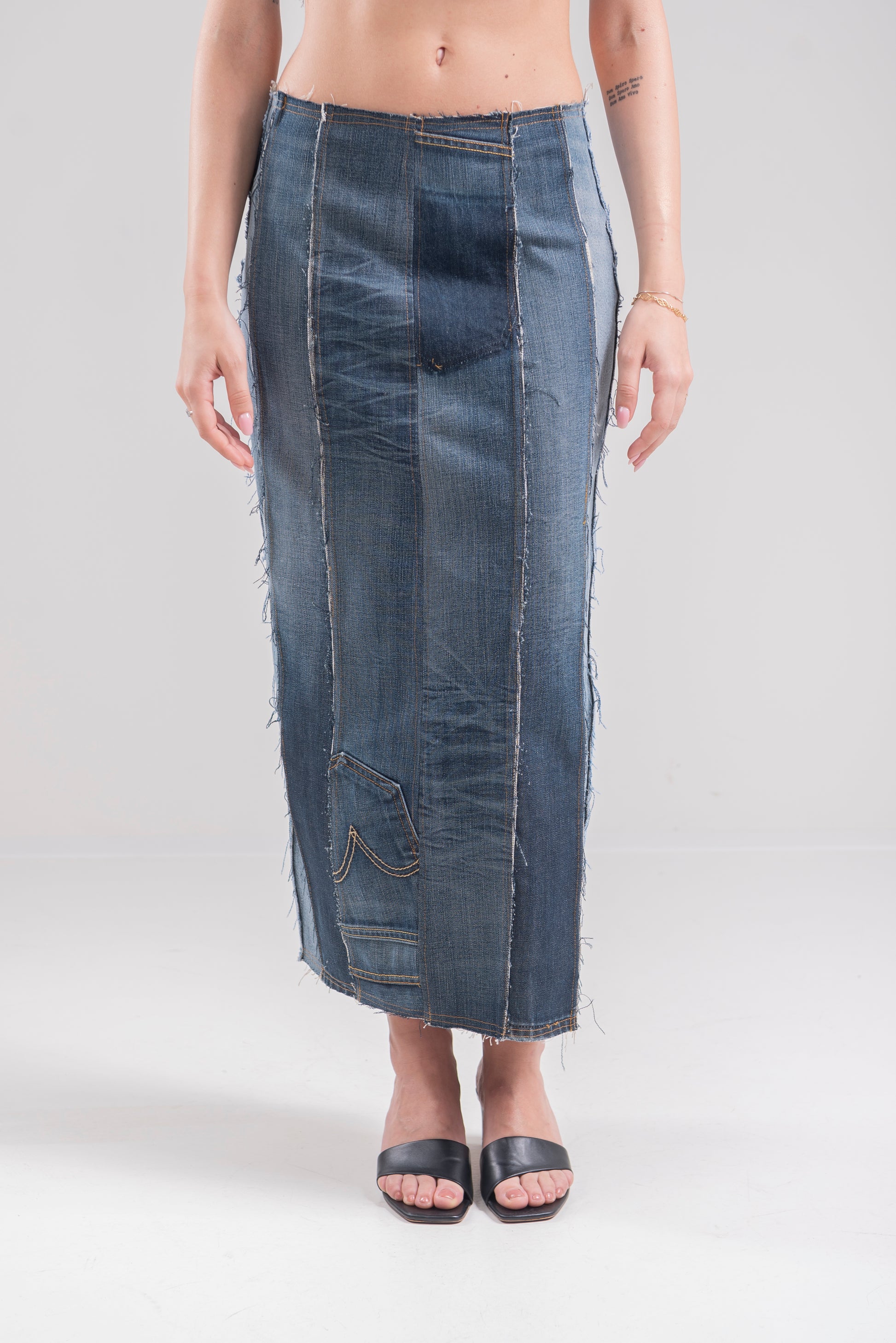 Gonna lunga in denim rigenerato costruita a pannelli. Dal taglio dritto ma fluido, con spacco sul dietro.
