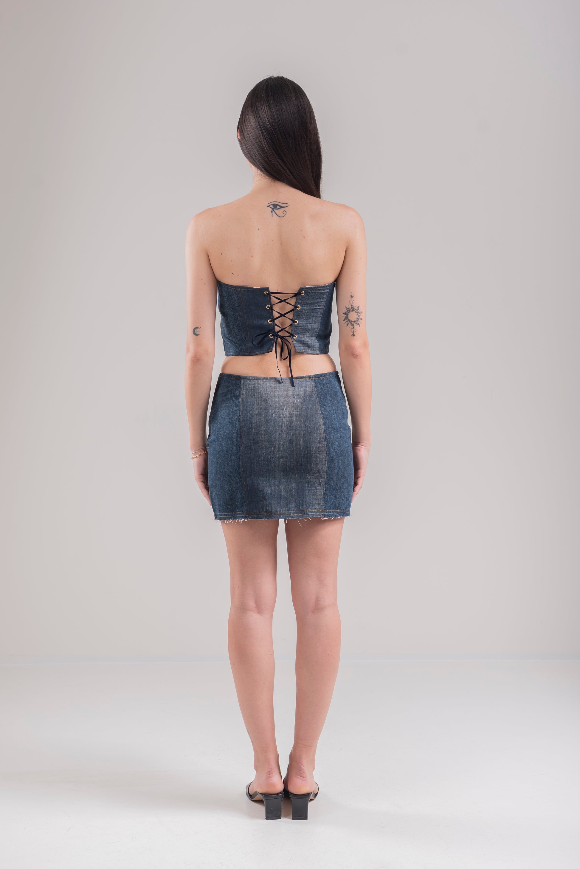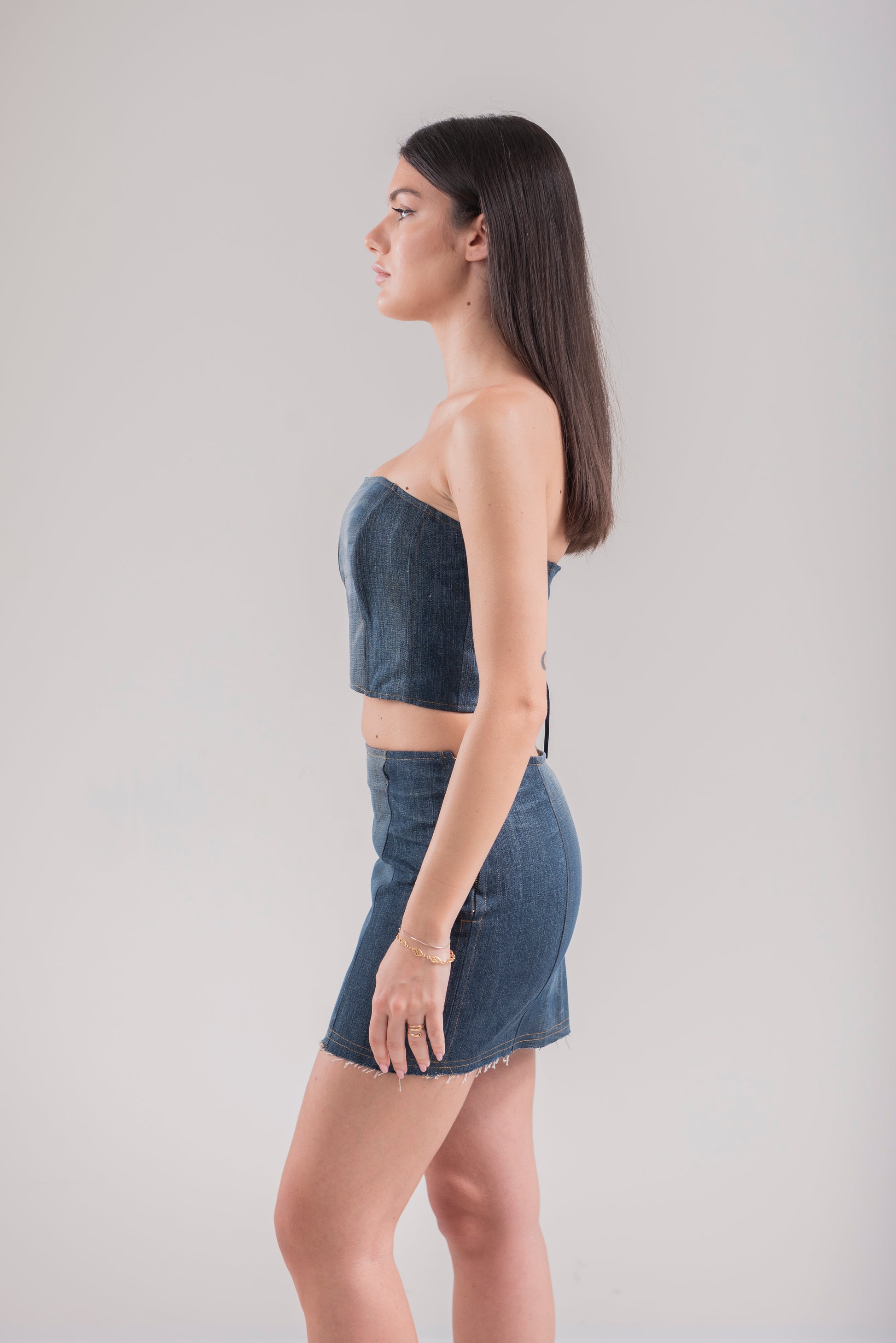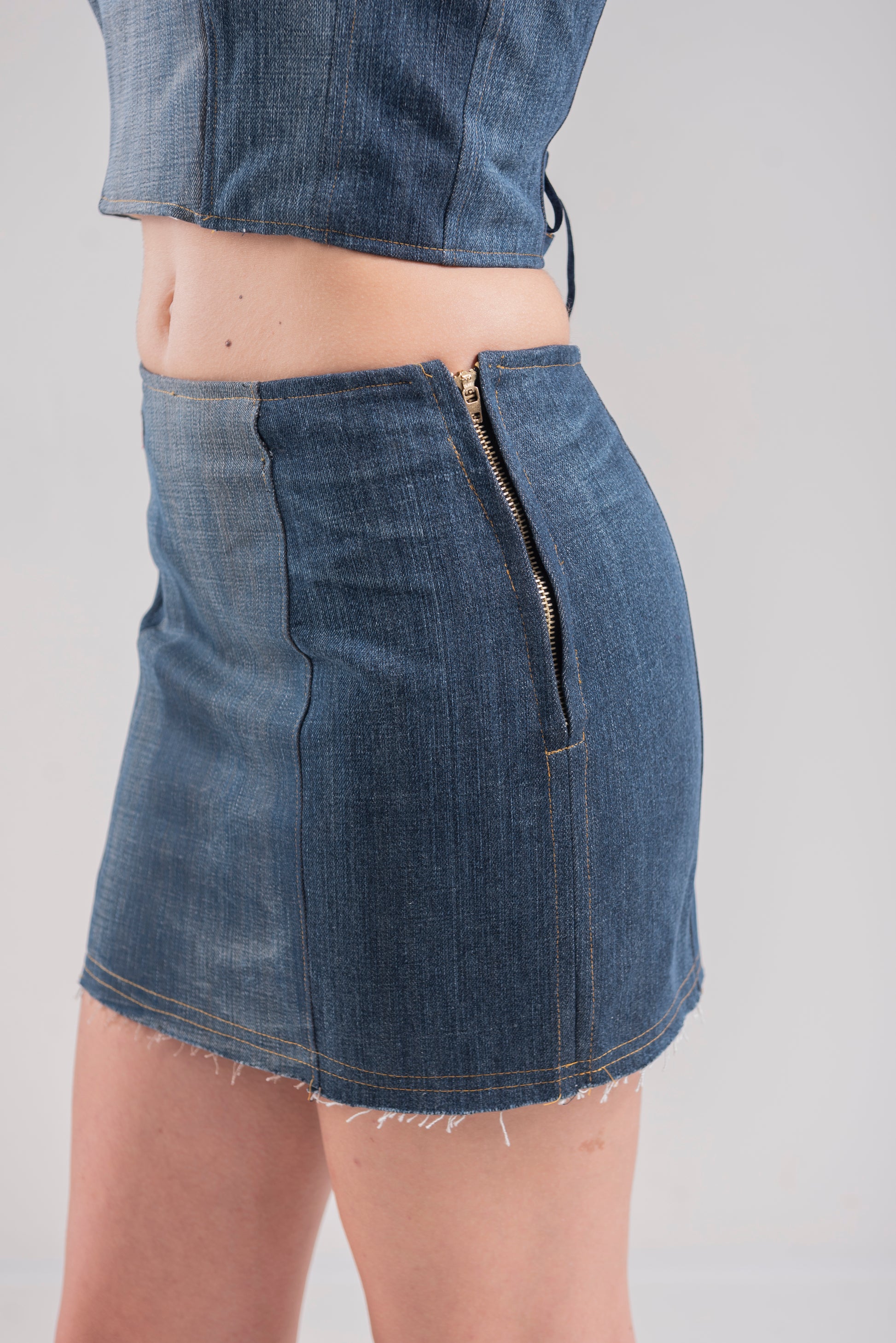 Minigonna in denim rigenerato dal design minimal, linea a tubo.