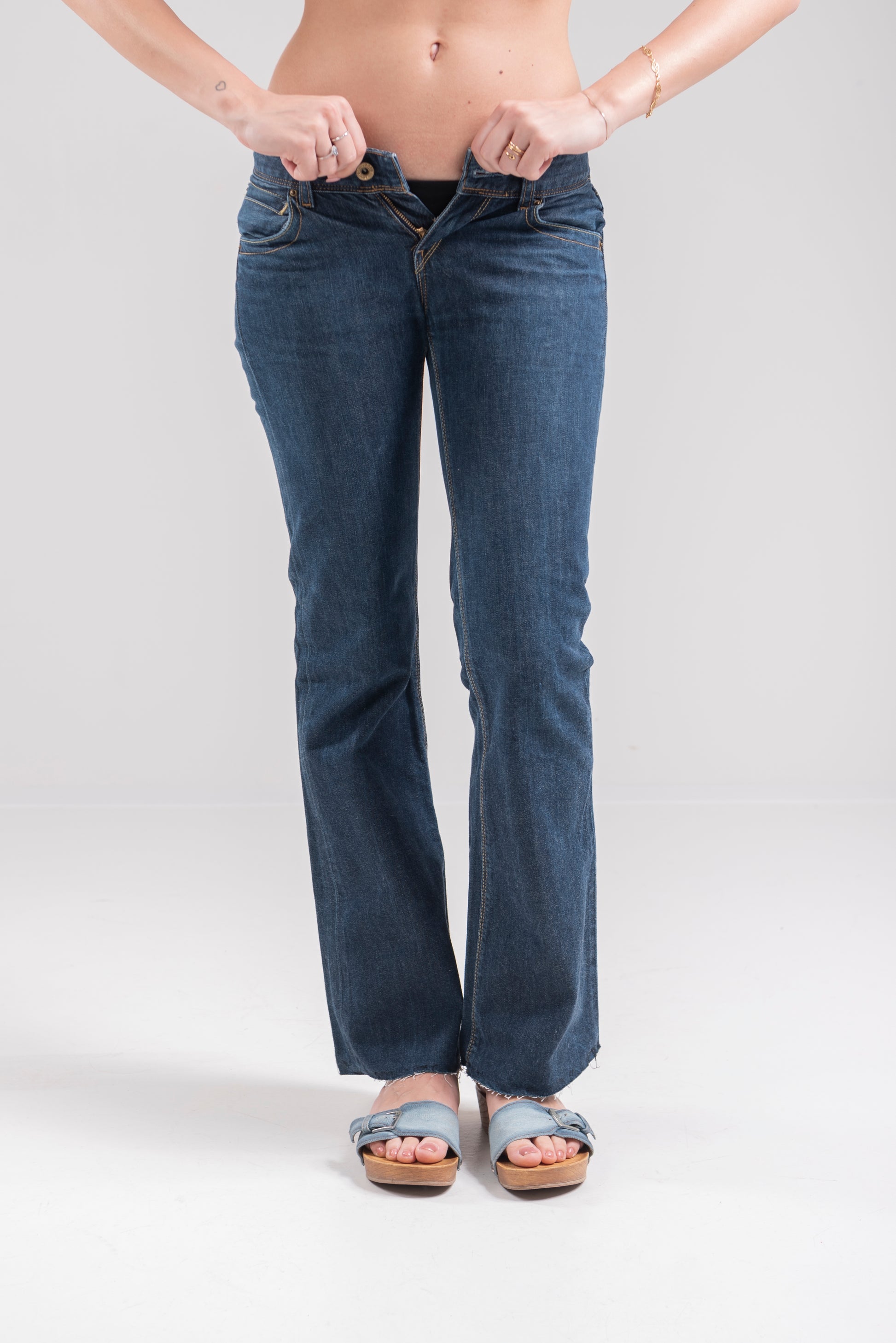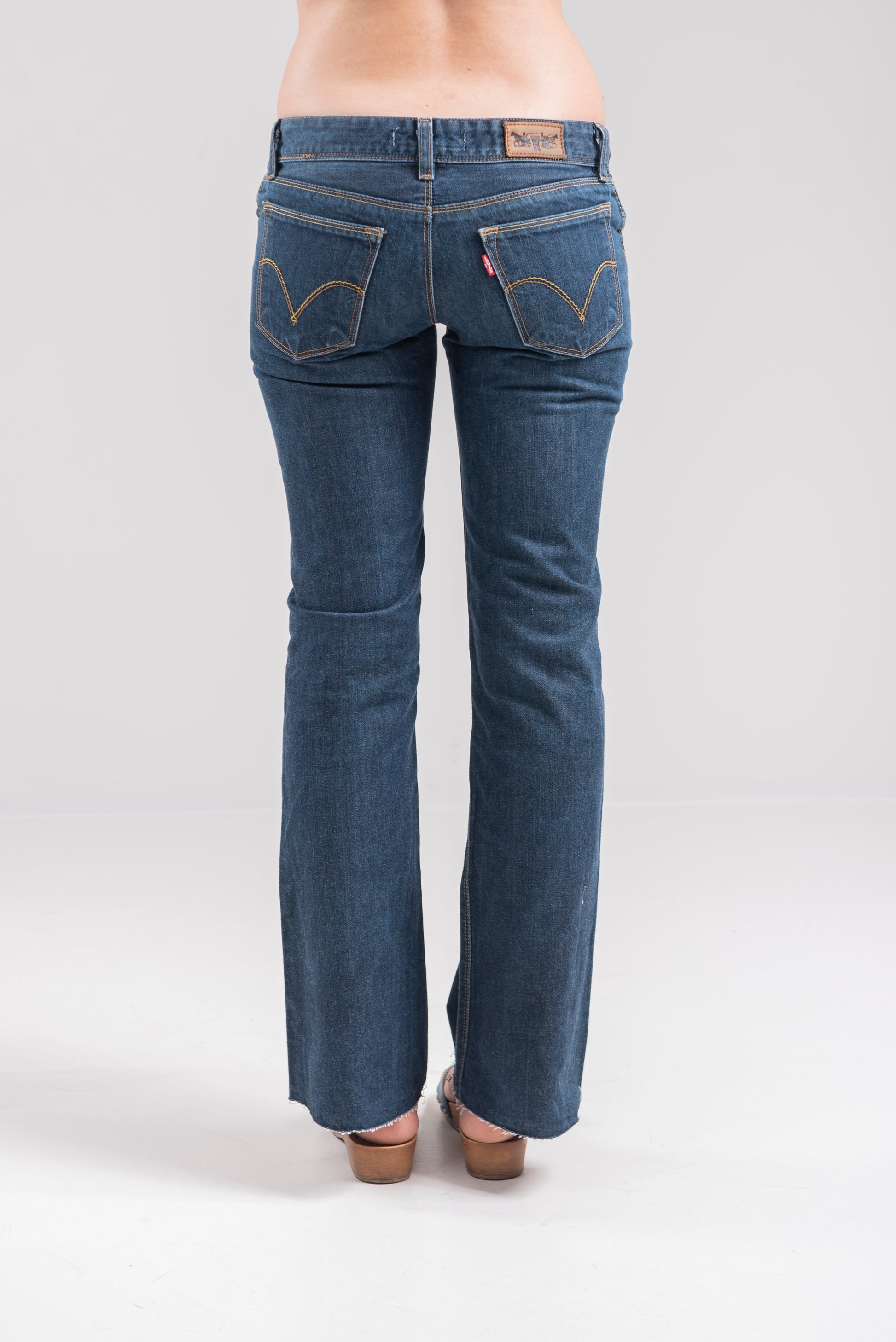 Jeans Levi’s modello 572 remade con fondo a zampa lasciato a taglio vivo, lunghezza capri.