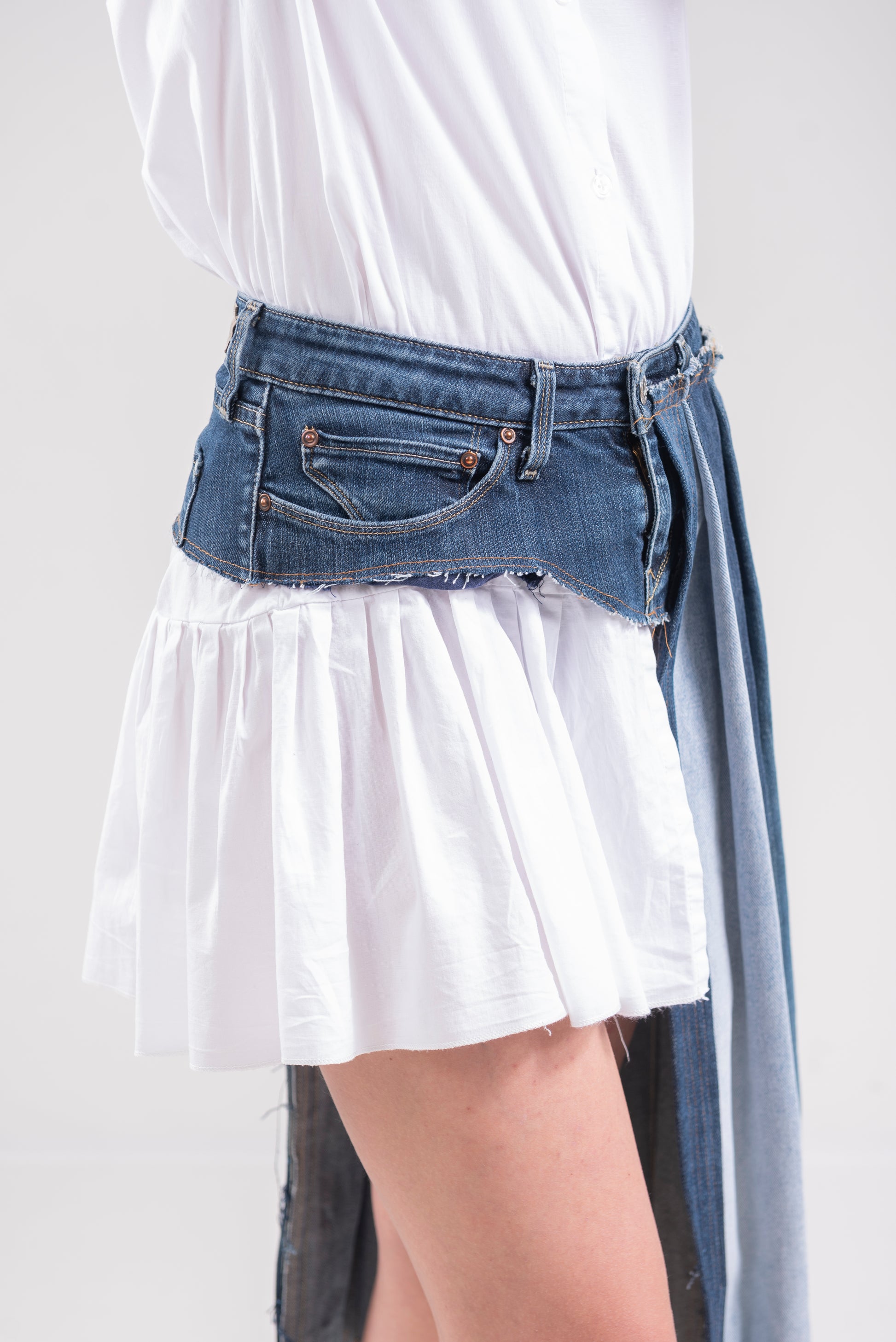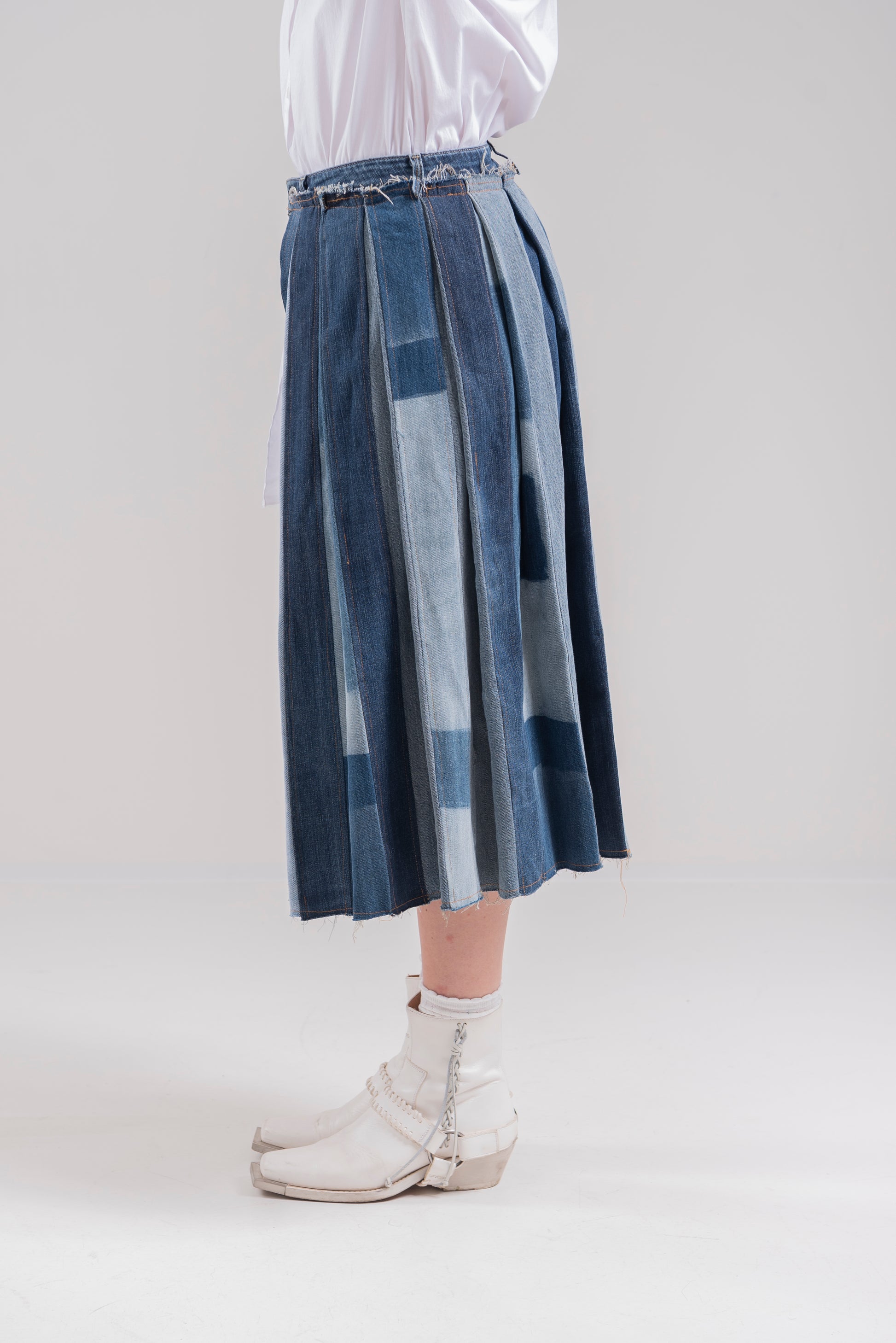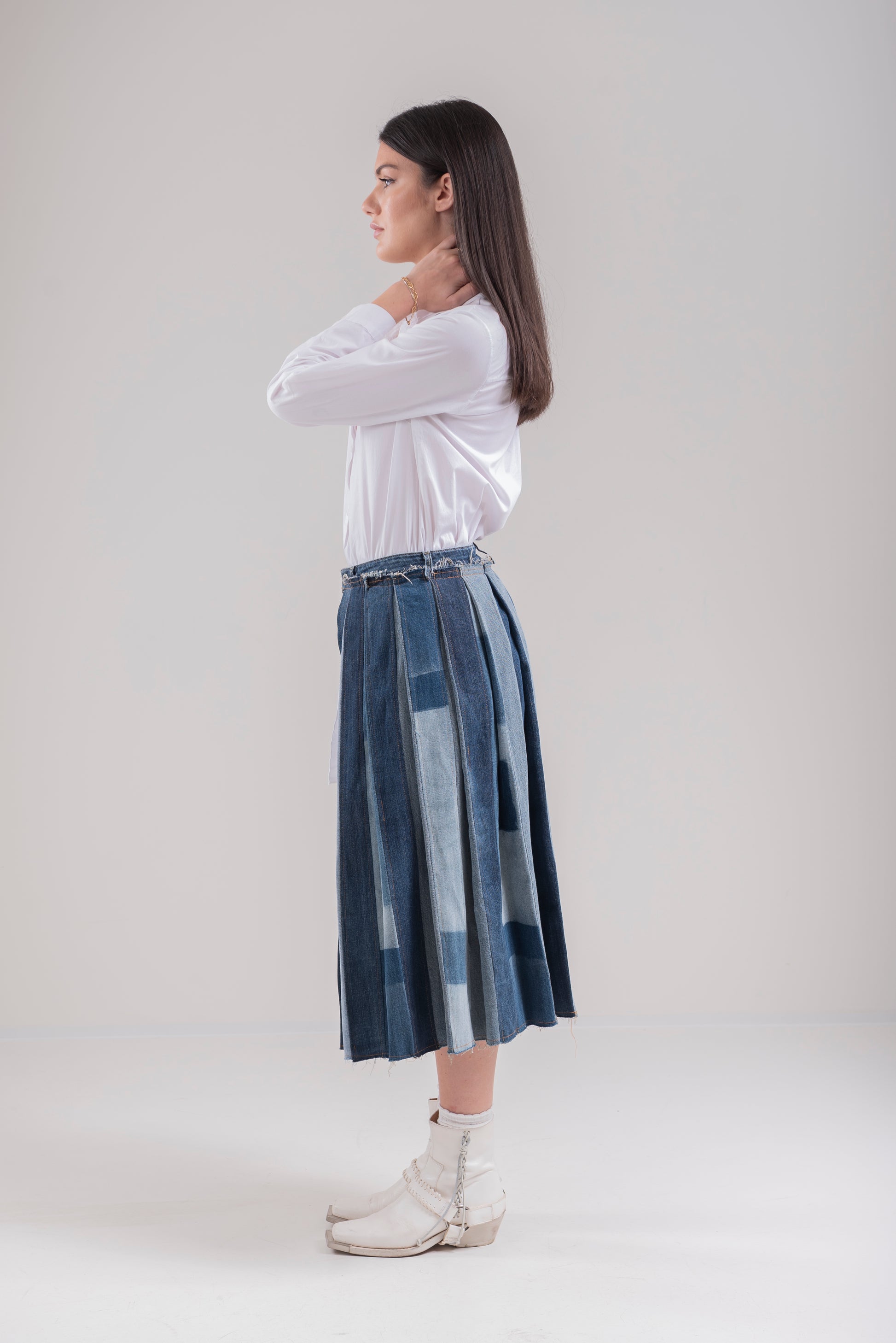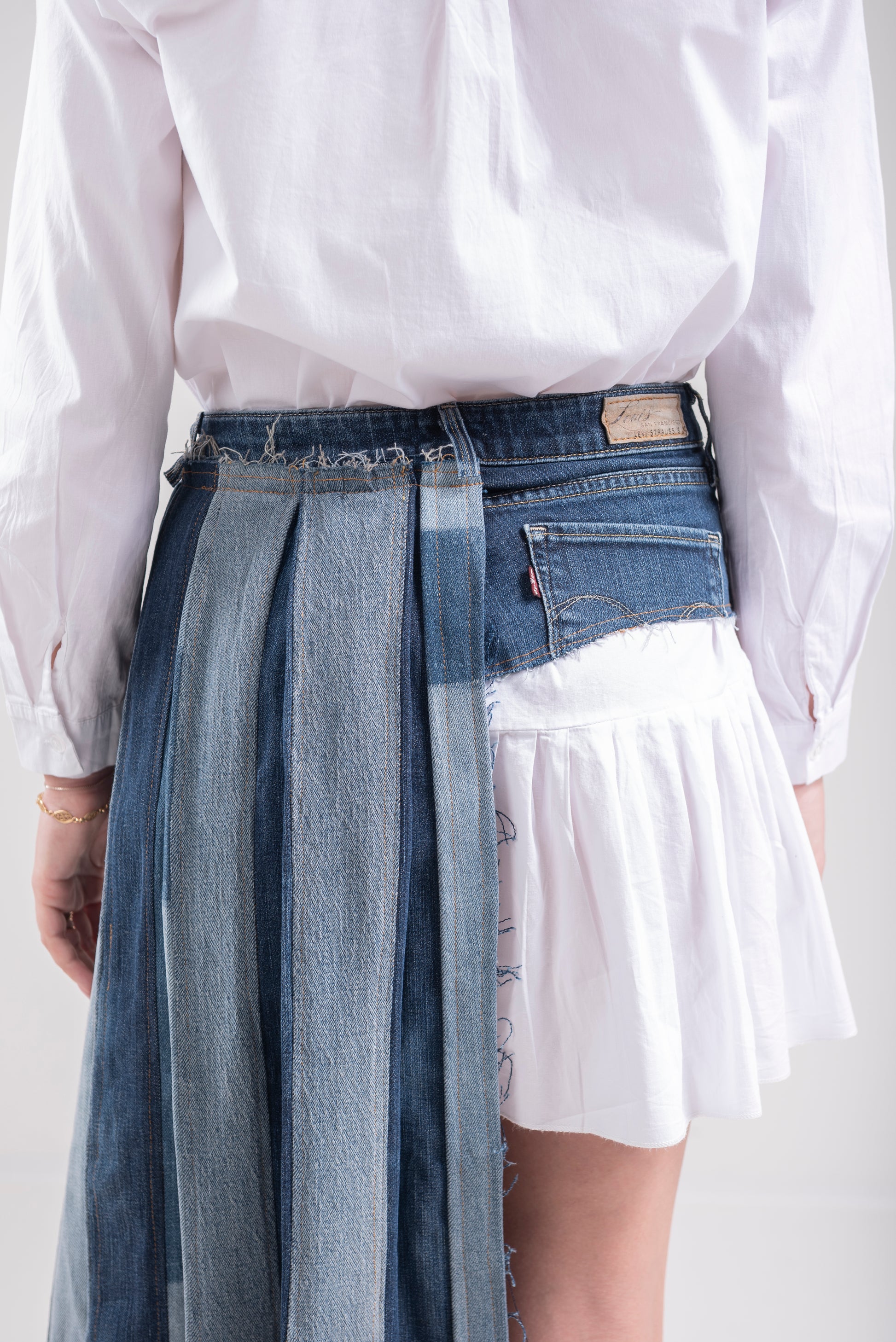Emblema della sartorialità e della visione artigianale del brand. Mezzo kilt in denim rigenerato costituito da una struttura a pieghe tagliate e assemblate una per una, sovrapposte su bustino originale dei jeans, completo di passanti e abbottonatura.